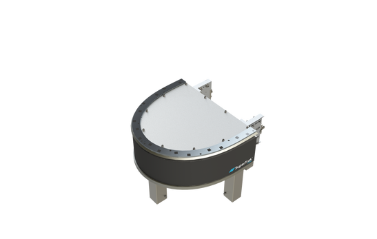 The 500mm diameter 180-degree curve minimizes the space inside the machine, offering manufacturers options to mount tooling on the outside of the conveyance platform.